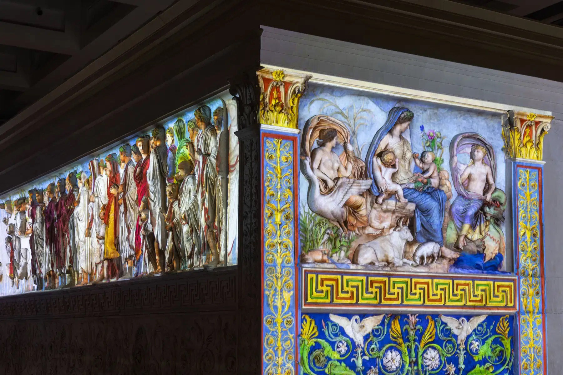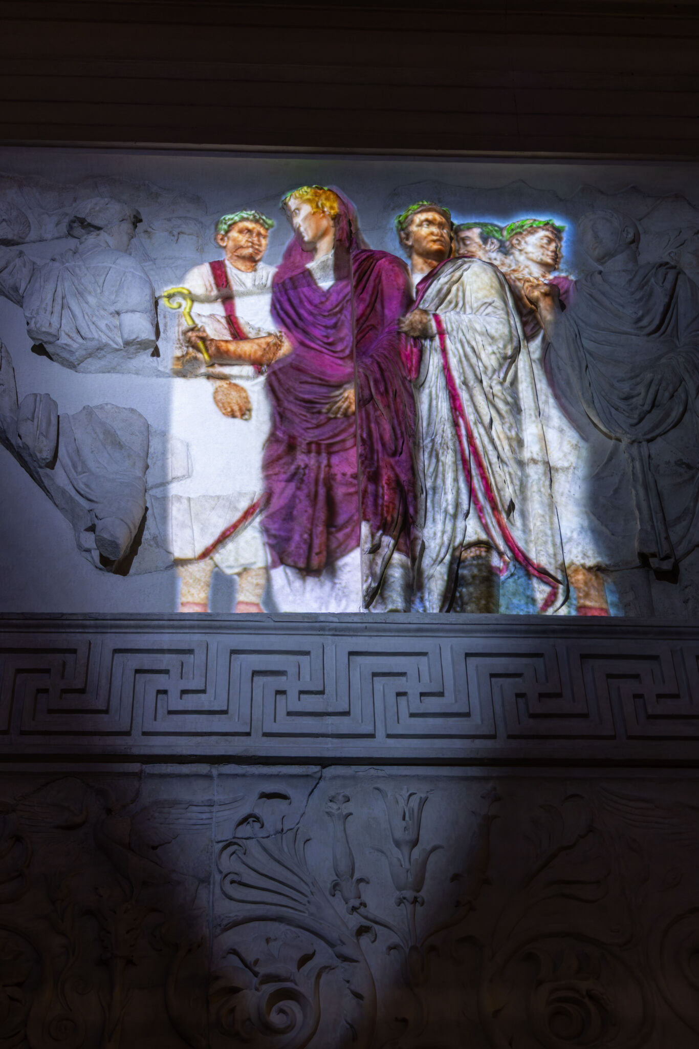 Grazie alla tecnica del videomapping, in una policromia molto vicina a quella originaria, il fronte occidentale, con i pannelli di Enea sacrificante ai Penati e del Lupercale, quello orientale con i pannelli della Tellus e della Dea Roma, ma anche, per la prima volta, le due grandi processioni laterali, prenderanno vita.
